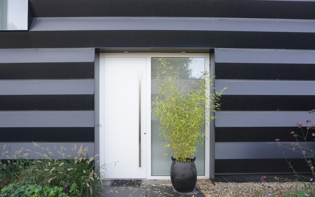 Moderne vrijstaande compacte woning met wit stucwerk buitengevel